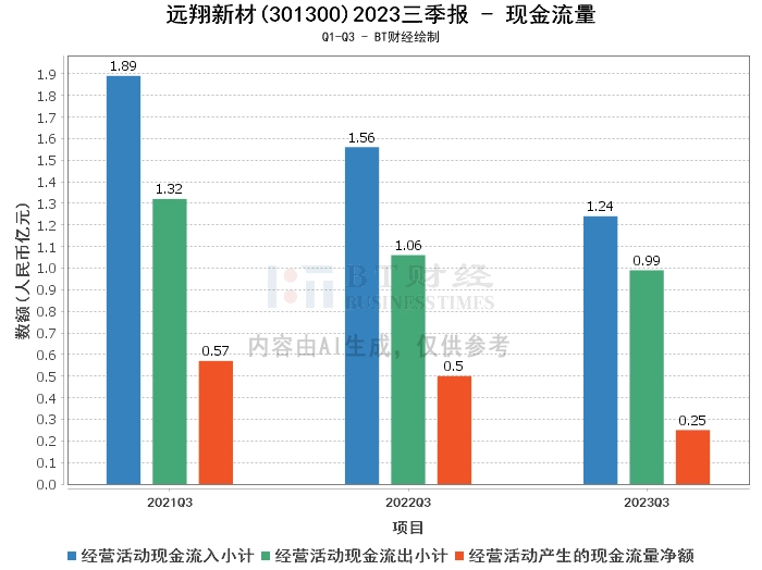 在现金流量方面,2023年三季度,远翔新材的经营活动产生的现金流量净额为2543.7万元,较上年同期的5012.64万元下降了49.25%。经营活动现金流入小计为1.24亿元,较上年同期的1.56亿元有所减少。经营活动现金流出小计为9884.71万元,较上年同期的1.06亿元有所减少。