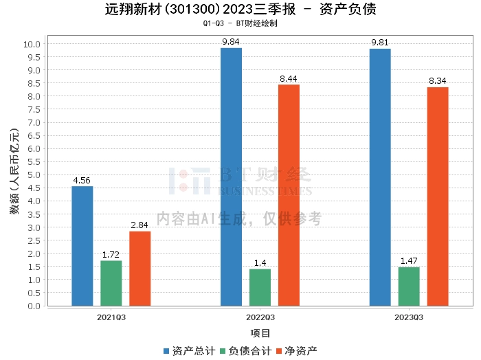 在资产负债方面,2023年三季度末,远翔新材的总资产为9.81亿元,相比上年度末的9.67亿元有所增长。负债合计为1.47亿元,略高于上年度末的1.4亿元。净资产为8.34亿元,较上年度末的8.27亿元有所提升。资产负债率为14.96%,较上年度末的14.46%有所上升。