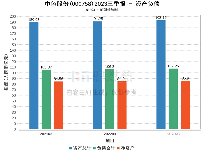 从资产负债方面来看,中色股份2023年三季度的资产总计为193.15亿元,相比上年度末的200.5亿元有所下降。负债合计为107.25亿元,较上年度末的119.45亿元减少。公司的净资产为85.9亿元,相比上年度末的81.05亿元有所增长。资产负债率为55.53%,较上年度末的59.58%有所下降。这表明公司的负债负担有所减轻,净资产的增长也反映出公司的盈利能力有所提升。