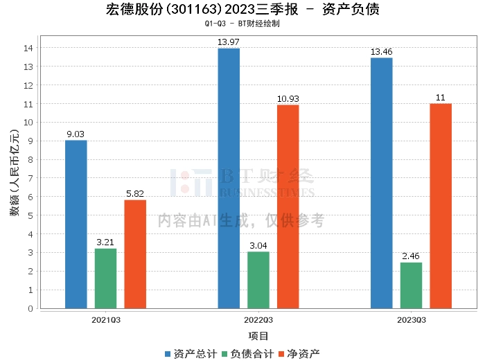 从资产负债方面看,2023年三季度末,宏德股份的总资产为13.46亿元,相比上年度末的14.92亿元有所下降。负债总额为2.46亿元,较上年度末的4.09亿元大幅降低,净资产为11亿元,略高于上年度末的10.83亿元。资产负债率为18.27%,较上年度末的27.44%显著下降,这表明公司的负债结构得到了优化。