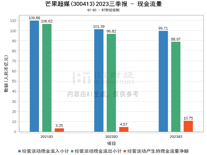 在现金流量方面,芒果超媒2023年三季度的经营活动产生的现金流量净额为10.75亿元,相比上年同期的4.57亿元增长了135.06%。经营活动现金流入小计为99.71亿元,相比上年同期的101.39亿元略有下降。经营活动现金流出小计为88.97亿元,相比上年同期的96.82亿元有所下降。这主要是由于本报告期经营性项目支出减少,以及收回的银行理财高于购买的银行理财等原因。