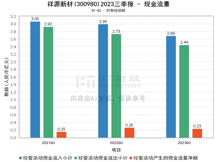 在现金流量方面,祥源新材2023年三季度的经营活动产生的现金流量净额为2319.06万元,相比上年同期的2595.84万元下滑了10.66%。经营活动现金流入小计为2.68亿元,相比上年同期的2.99亿元下滑了10.37%。经营活动现金流出小计为2.44亿元,相比上年同期的2.73亿元下滑了10.62%。