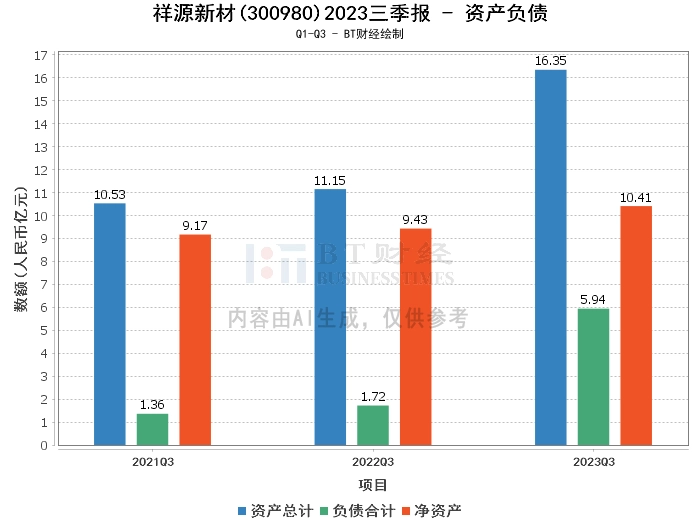 在资产负债方面,祥源新材2023年三季度的总资产为16.35亿元,相比上年度末的11.64亿元增长了40.47%。负债合计为5.94亿元,相比上年度末的2.09亿元增长了184.21%,净资产为10.41亿元,相比上年度末的9.55亿元增长了9.01%。资产负债率为36.35%,相比上年度末的17.96%有所上升。