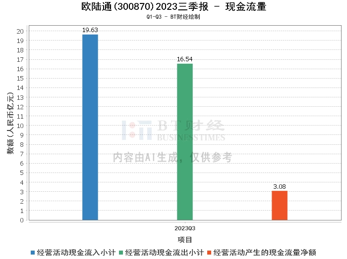 在现金流量方面,欧陆通2023年三季度的经营活动产生的现金流量净额为3.08亿元,相比上年同期的7485.89万元,增长了312.01%。经营活动现金流入小计为19.63亿元,相比上年同期的20.28亿元,略有下降。经营活动现金流出小计为16.54亿元,相比上年同期的19.54亿元,有所减少。这些变动主要是由于公司在报告期内的业务扩展和研发投入。