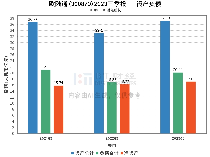 在资产负债方面,欧陆通2023年三季度末的总资产为37.13亿元,相比上年度末的33.48亿元,增长了11.22%。负债合计为20.11亿元,相比上年度末的17.2亿元,增长了16.93%。净资产为17.03亿元,相比上年度末的16.28亿元,增长了4.62%。资产负债率为54.15%,相比上年度末的51.37%,略有上升。这些变动主要是由于公司在报告期内的业务扩展和研发投入。