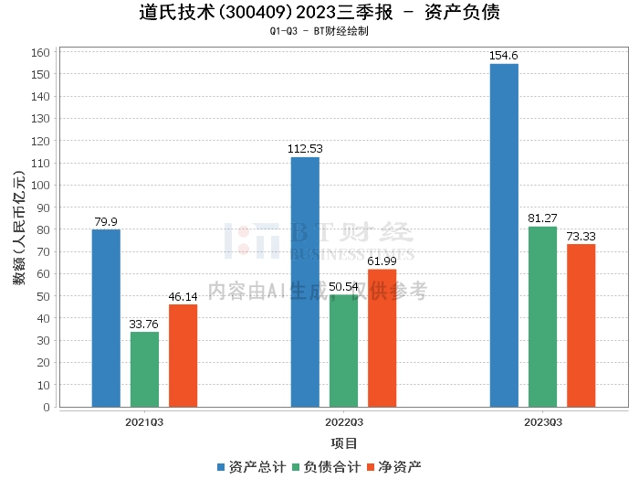 从2023年三季度财报数据看,道氏技术的总资产达到154.6亿元,相比上年度末的117.03亿元增长了32.10%。负债合计为81.27亿元,相比上年度末的53.29亿元增长了52.57%。净资产为73.33亿元,相比上年度末的63.74亿元增长了15.08%。资产负债率为52.57%,相比上年度末的45.53%有所上升。
