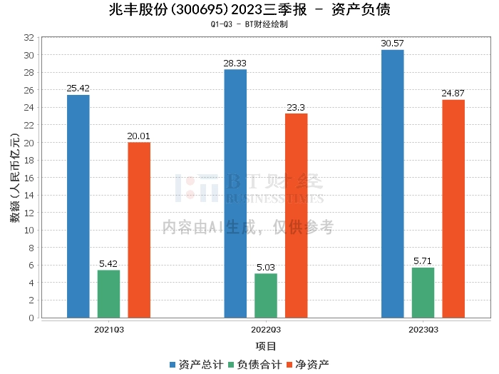 在资产负债方面,兆丰股份2023年三季度末的总资产为30.57亿元,相较于上年度末的28.66亿元有所增长。负债合计为5.71亿元,较上年度末的5.01亿元有所上升。净资产为24.87亿元,较上年度末的23.65亿元有所增加。资产负债率为18.67%,较上年度末的17.47%有所上升。