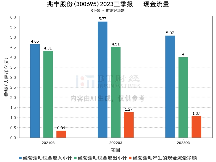 在现金流量方面,兆丰股份2023年前三季度的经营活动产生的现金流量净额为1.07亿元,较上年同期的1.27亿元有所减少。经营活动现金流入小计为5.07亿元,较上年同期的5.77亿元有所减少。经营活动现金流出小计为4亿元,较上年同期的4.51亿元有所减少。