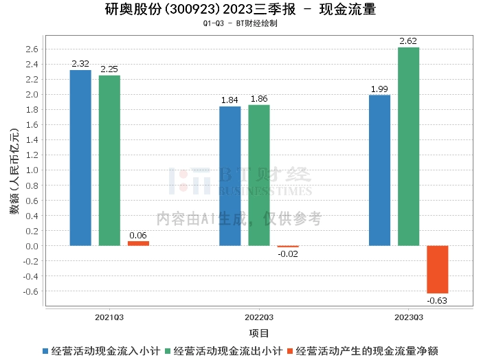 现金流量方面,公司2023年三季度经营活动产生的现金流入为1.99亿元,相比上年同期的1.84亿元有所增加。但经营活动产生的现金流出也从上年同期的1.86亿元增加至2.62亿元。因此,经营活动产生的现金流量净额为-6310.51万元,相比上年同期的-245.45万元大幅下滑。