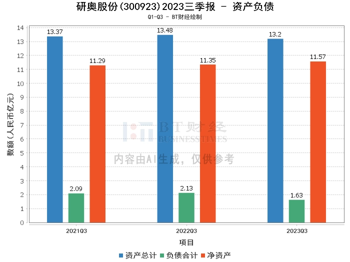 从资产负债方面看,研奥股份2023年三季度的总资产为13.2亿元,相比上年度末的13.64亿元有所下降。负债总额也从上年度末的2.21亿元降至1.63亿元。净资产则从上年度末的11.43亿元略微增长至11.57亿元。资产负债率从上年度末的16.17%降至12.34%。这些数据表明,公司的负债状况有所改善,但资产规模有所缩小。