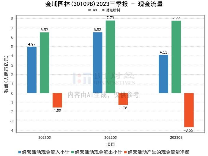 在现金流量方面,金埔园林2023年三季度的经营活动现金流入小计为4.11亿元,相比上年同期的6.53亿元大幅下滑。经营活动现金流出小计为7.77亿元,与上年同期的7.79亿元基本持平。这表明公司在经营活动方面的现金流压力较大,主要是由于本期工程回款比同期减少所导致。