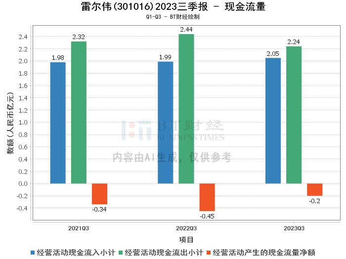 在现金流量方面,雷尔伟2023年三季度的经营活动现金流入小计为2.05亿元,相比上年同期的1.99亿元,有所增长。经营活动现金流出小计为2.24亿元,相比上年同期的2.44亿元,有所下降。经营活动产生的现金流量净额为-1952.47万元,相比上年同期,增长了56.59%。