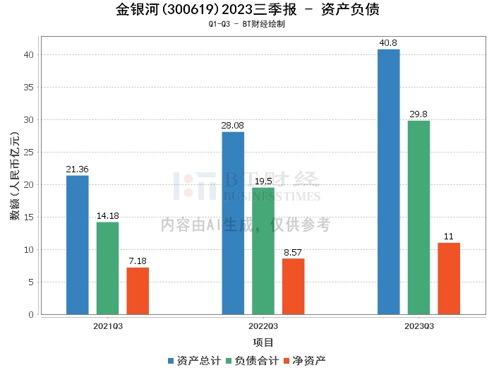 从2023年三季报来看,金银河公司的总资产从上年度末的32.19亿元增长到本报告期末的40.8亿元,增长幅度达到26.73%。负债合计从上年度末的22.7亿元增长到本报告期末的29.8亿元,净资产从上年度末的9.49亿元增长到本报告期末的11亿元。资产负债率从上年度末的70.51%上升到本报告期末的73.04%。