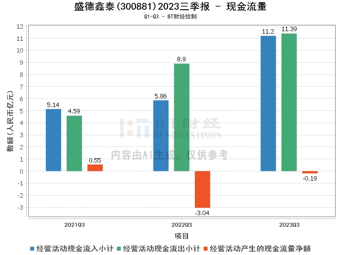 在现金流量方面,盛德鑫泰2023年三季度的经营活动现金流入小计为11.2亿元,相比上年同期的5.86亿元增长了91.12%。经营活动现金流出小计为11.39亿元,相比上年同期的8.9亿元增长了27.87%。经营活动产生的现金流量净额为-1930万元,相比上年同期的-3.04亿元,现金流量净额的负值有所减少,这主要是由于已贴现且在资产负债表日尚未到期的应收票据减少所致。
