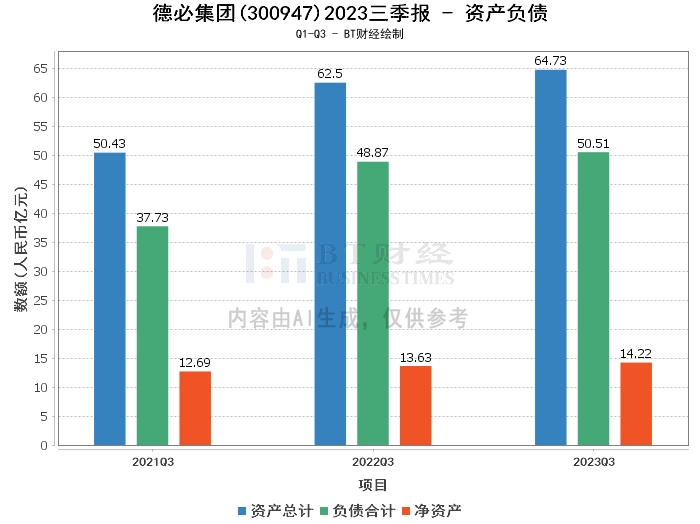 从资产负债方面看,截至2023年三季度末,德必集团的总资产达到64.73亿元,相比上年度末的61.68亿元有所增长。负债合计为50.51亿元,相比上年度末的48.25亿元也有所上升。净资产为14.22亿元,较上年度末的13.43亿元有所提升。资产负债率为78.03%,略低于上年度末的78.23%。