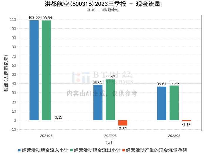 从现金流量来看,洪都航空2023年三季度的经营活动现金流入小计为36.61亿元,较上年同期的38.65亿元有所减少。经营活动现金流出小计为37.75亿元,较上年同期的44.47亿元减少。这些变化主要是由于公司购买商品支付的现金减少。
