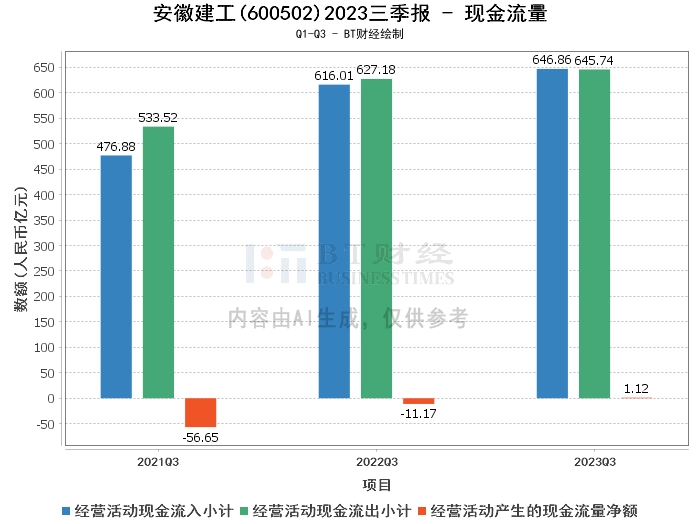 在现金流量方面,安徽建工2023年三季度的经营活动产生的现金流量净额为1.12亿元,相比上年同期的-11.17亿元,现金流已经从负转正。经营活动现金流入小计646.86亿元,相比上年同期的616.01亿元有所增长。经营活动现金流出小计645.74亿元,相比上年同期的627.18亿元有所增长。这些数据的变动主要系ppp项目净流出减少及房地产业务净流入增加等所致。