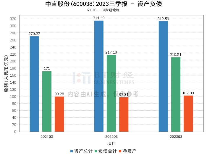 在资产负债方面,中直股份2023年三季度末的总资产为312.59亿元,相比上年度末的277.41亿元有所增长。负债合计为210.51亿元,较上年度末的176.84亿元有所上升。净资产为102.08亿元,较上年度末的100.58亿元略有增长。资产负债率为67.34%,较上年度末的63.75%有所上升。这些变动主要是由于本期收到票据较多,产品交付量较大,确认收入较多,材料采购验收量较大,部分企业新增短期借款较多,兑付票据金额较大,预收货款,进项税额较大,应交增值税减少,一年内到期的长期借款到期还款,部分企业新增长期借款较多,收到科研拨款较多等因素影响。
