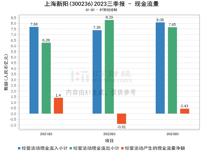 在现金流量方面,2023年三季度,上海新阳的经营活动产生的现金流量净额为4316.06万元,较上年同期的-9085.71万元有显著改善。经营活动现金流入小计为8.08亿元,较上年同期的7.39亿元有所增长。经营活动现金流出小计为7.65亿元,较上年同期的8.29亿元有所下降。这些数据显示,公司的现金流状况得到了显著改善,经营活动的现金流入增加,现金流出减少,整体现金流状况良好。