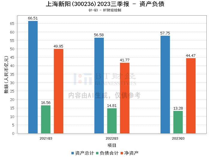 从资产负债方面来看,2023年三季度末,上海新阳的总资产为57.75亿元,相比上年度末的56.2亿元有所增长。负债总额为13.28亿元,较上年度末的14.66亿元有所下降。净资产为44.47亿元,较上年度末的41.55亿元有所增长。资产负债率为22.99%,较上年度末的26.08%有所下降。这些数据显示,公司的资产规模在稳步增长,负债规模得到了有效控制,整体财务状况良好。