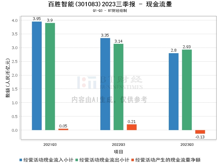 在现金流量方面,百胜智能2023年三季度的经营活动产生的现金流量净额为-1296.71万元,较上年同期的2057.96万元大幅下滑,主要是由于应付票据保证金增加所致。经营活动现金流入小计为2.8亿元,较上年同期的3.35亿元有所减少。经营活动现金流出小计为2.93亿元,较上年同期的3.14亿元有所增加。