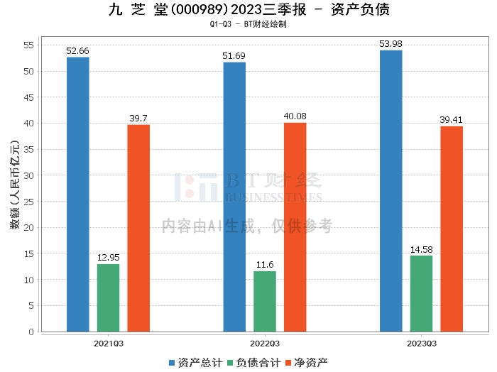 在资产负债方面,九芝堂2023年三季度的总资产为53.98亿元,相比上年度末的52.4亿元有所增长。负债总额为14.58亿元,相比上年度末的12.58亿元有所增加。公司的净资产为39.41亿元,相比上年度末的39.81亿元略有下降。资产负债率为27%,相比上年度末的24.02%有所上升。这些数据显示,九芝堂在资产负债方面整体稳定,但负债总额和资产负债率的增长值得关注。