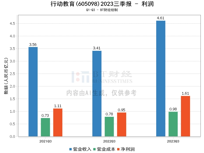 其次,从利润方面来看,行动教育2023年三季度的营业收入为4.61亿元,相比上年同期的3.41亿元增长了35.36%,主要原因是公司执行大客户战略成果显著,品牌影响力持续提升,人才梯队建设卓有成效,培训和咨询业务订单量充裕,培训课程及咨询服务开展增加。营业利润为1.89亿元,相比上年同期的1.1亿元有所增长。净利润为1.61亿元,相比上年同期的9517.41万元增长了70.72%,主要系营业收入上升,且由于开课及管理效率提升,成本及费用增幅低于收入增幅所致。