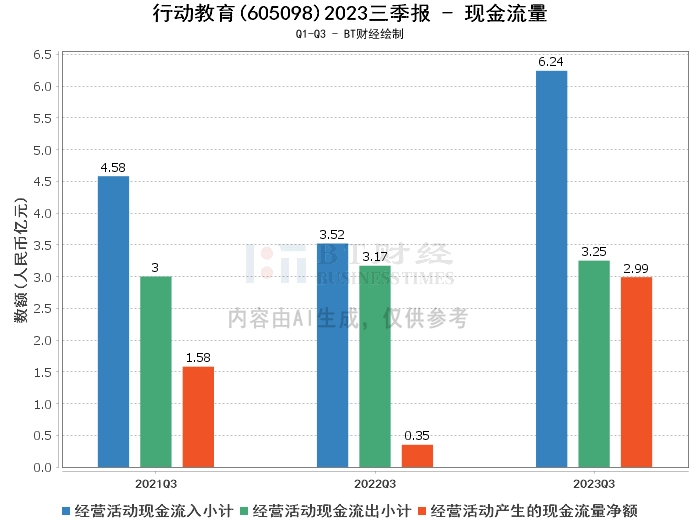 再次,从现金流量方面来看,行动教育2023年三季度经营活动产生的现金流量净额为2.99亿元,相比上年同期的3520.89万元增长了749.99%,主要系本期业绩增加,业务收款增加。