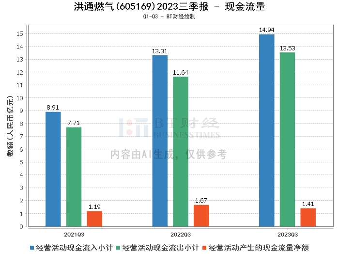 在现金流量方面,洪通燃气2023年三季度经营活动产生的现金流量净额为1.41亿元,较上年同期的1.67亿元有所下降。经营活动现金流入小计为14.94亿元,较上年同期的13.31亿元有所增长。经营活动现金流出小计为13.53亿元,较上年同期的11.64亿元有所增加。