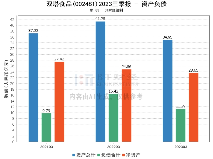 从资产负债方面来看,双塔食品2023年三季度末的总资产为34.95亿元,相比上年度末的39.24亿元有所下降。负债合计为11.29亿元,较上年度末的15.51亿元也有所减少。净资产为23.65亿元,与上年度末的23.73亿元相比略有下降。资产负债率为32.32%,较上年度末的39.53%有所下降。这些变化主要是由于公司偿还了到期的银行借款,预付了原料采购款项,以及原材料和库存商品的减少。
