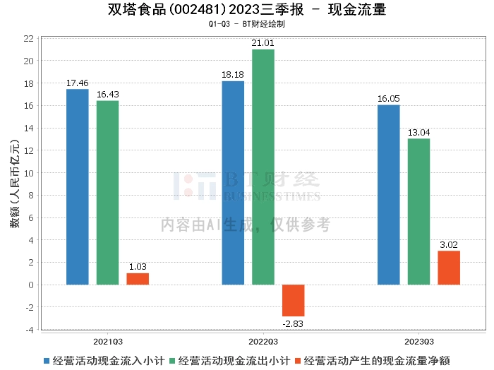 在现金流量方面,双塔食品2023年三季度的经营活动产生的现金流量净额为3.02亿元,较上年同期的-2.83亿元大幅增长。经营活动现金流入小计为16.05亿元,较上年同期的18.18亿元有所减少。经营活动现金流出小计为13.04亿元,较上年同期的21.01亿元有所减少。这些变化主要是由于购买商品、接受劳务支付的现金减少所致。