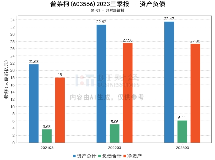 从资产负债方面来看,普莱柯2023年三季度末的总资产为33.47亿元,相较于上年度末的33.96亿元有所减少。负债合计为6.11亿元,较上年度末的5.92亿元有所增加。公司的净资产为27.36亿元,相较于上年度末的28.04亿元有所减少。资产负债率为18.26%,较上年度末的17.42%有所上升。