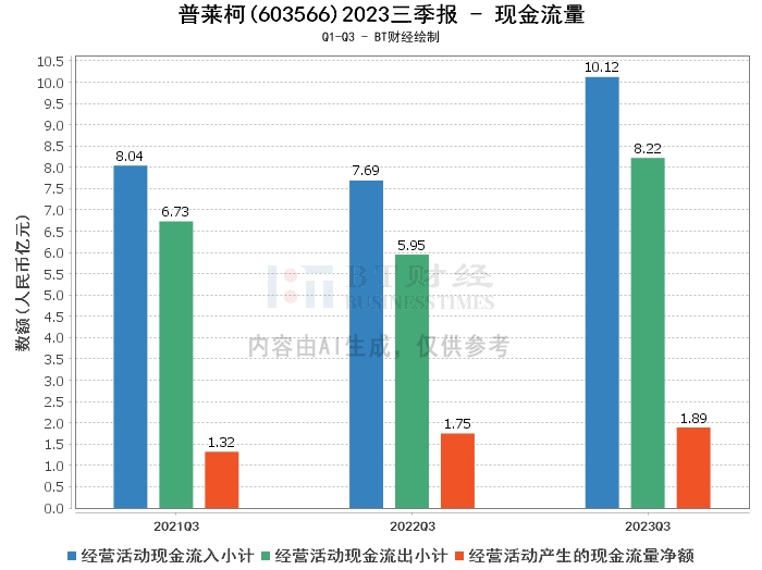 在现金流量方面,普莱柯2023年三季度的经营活动产生的现金流量净额为1.89亿元,较上年同期的1.72亿元增长了10.25%。经营活动现金流入小计为10.12亿元,较上年同期的7.73亿元有所增加。经营活动现金流出小计为8.22亿元,较上年同期的6.02亿元有所增加。