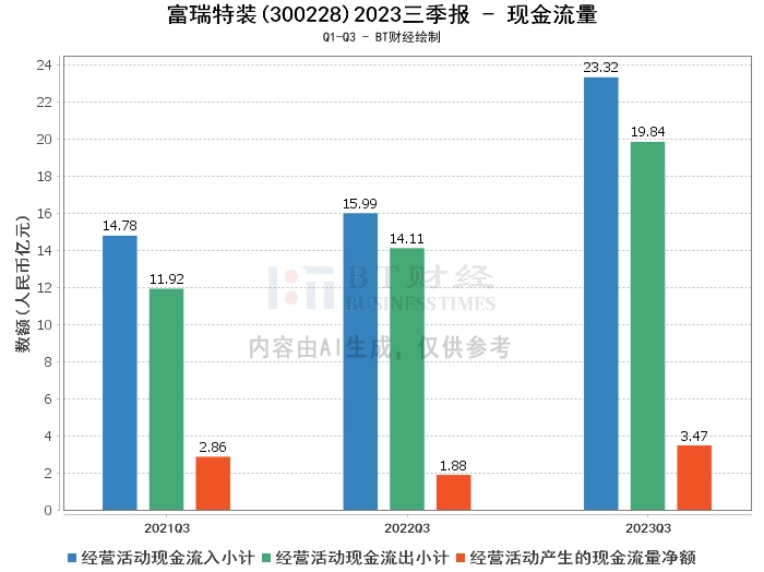 在现金流量方面,富瑞特装2023年三季度经营活动产生的现金流量净额为3.47亿元,相比上年同期的1.88亿元增长了84.65%。经营活动现金流入小计为23.32亿元,相比上年同期的15.99亿元有所增长。经营活动现金流出小计为19.84亿元,相比上年同期的14.11亿元有所增加。
