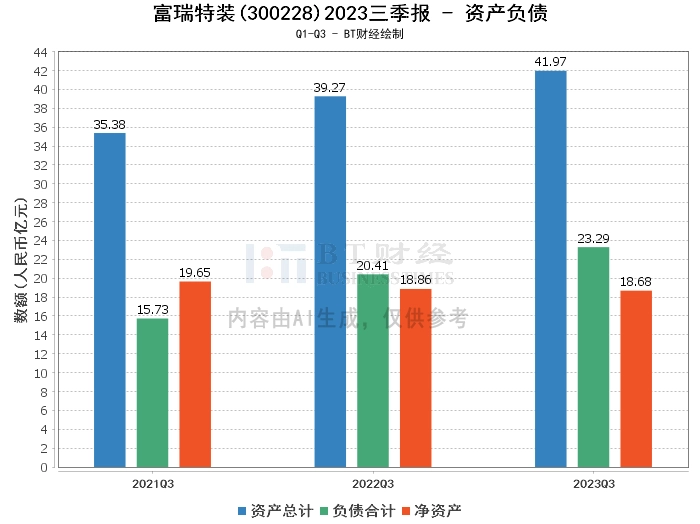 从资产负债方面来看,富瑞特装2023年三季度末的总资产为41.97亿元,相比上年度末的37.91亿元增长了10.73%。负债总额为23.29亿元,相比上年度末的20.34亿元有所增加。公司的净资产为18.68亿元,相比上年度末的17.56亿元有所增长。资产负债率为55.49%,相比上年度末的53.67%有所上升。