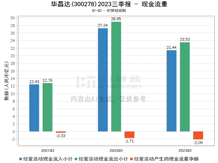 在现金流量方面,华昌达2023年三季报显示,公司年初至本报告期末的经营活动现金流入小计为21.44亿元,相比上年同期的27.24亿元下降了21.31%。经营活动现金流出小计为23.53亿元,相比上年同期的28.95亿元下降了18.73%。这些数据显示,公司的经营活动现金流入和现金流出都有所下降,且现金流出大于现金流入,显示公司的现金流动压力较大。