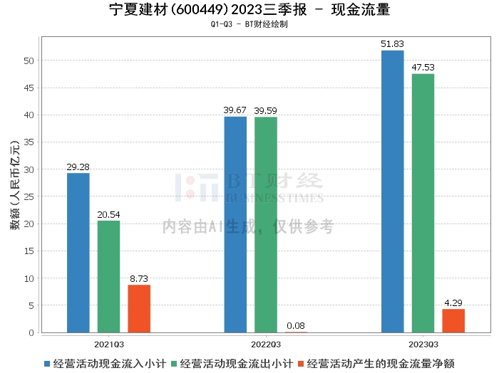 在现金流量方面,宁夏建材2023年三季度经营活动产生的现金流量净额为4.29亿元,相比上年同期的787.23万元大幅增长5353.37%。经营活动现金流入小计为51.83亿元,相比上年同期的39.67亿元增长了30.63%。经营活动现金流出小计为47.53亿元,相比上年同期的39.59亿元增长了20.05%。