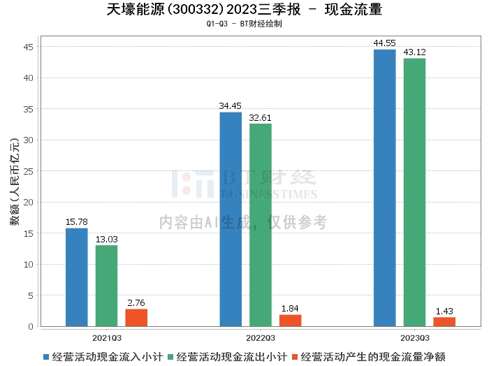 在现金流量方面,天壕能源的经营活动产生的现金流量净额在年初至本报告期末为1.43亿元,相比上年同期的1.84亿元有所下降。这可能是由于公司在扩大经营规模,增加投资导致的。然而,公司的经营活动现金流入小计和现金流出小计分别从上年同期的34.45亿元和32.61亿元增长到本报告期末的44.55亿元和43.12亿元,显示出公司的经营活动现金流动性增强。