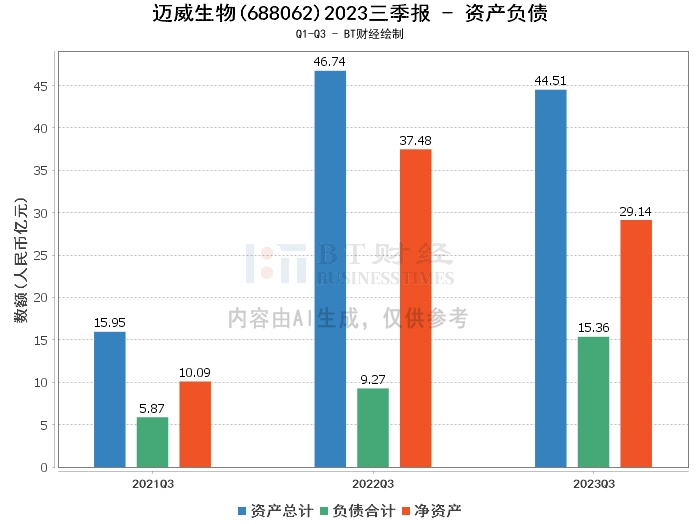 从资产负债方面看,迈威生物2023年三季度末的总资产为44.51亿元,相比上年度末的46.19亿元有所下降,负债合计为15.36亿元,相比上年度末的11.09亿元有所增加,资产负债率为34.52%,相比上年度末的24%有所上升。这可能反映出公司在扩大投资和运营规模,但也需要关注负债的增长是否过快。
