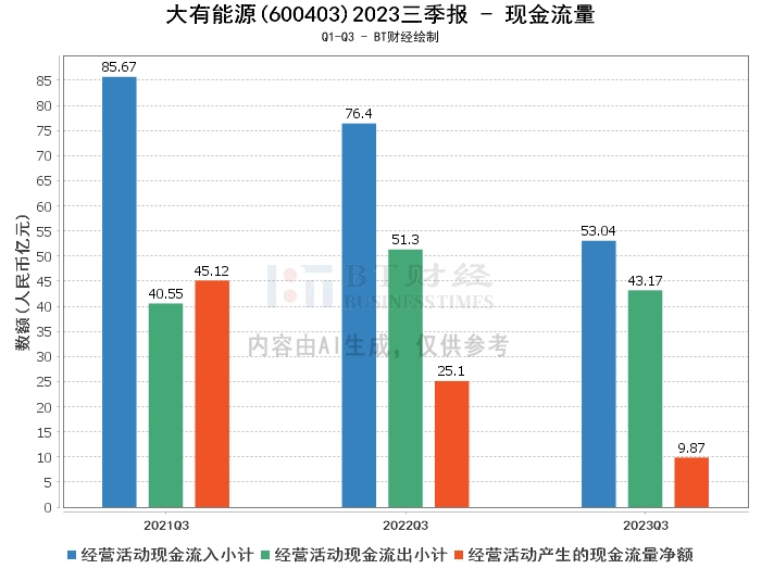 在现金流量方面,大有能源2023年三季度经营活动产生的现金流量净额为9.87亿元,较上年同期的25.1亿元大幅下降。经营活动现金流入小计为53.04亿元,较上年同期的76.4亿元有所减少。经营活动现金流出小计为43.17亿元,较上年同期的51.3亿元有所下降。这些变动主要是由于公司销量下降和售价下降,导致经营活动产生的现金流量净额较同期减少。