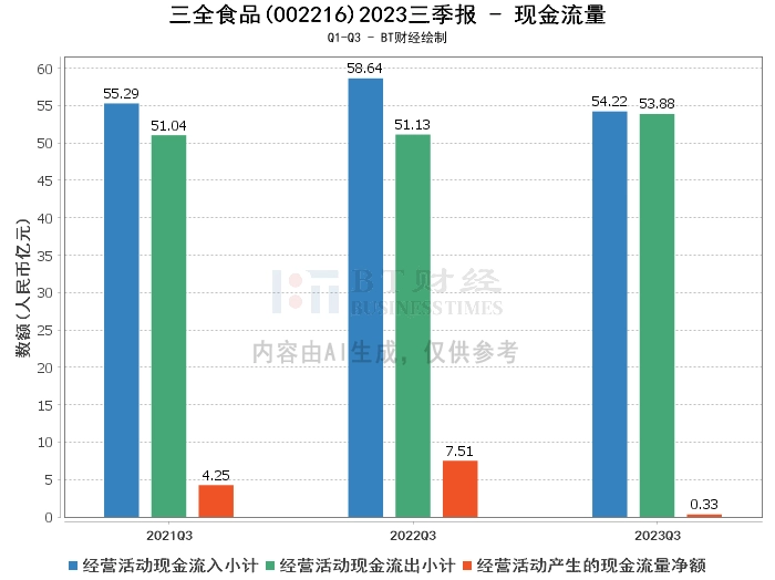 在现金流量方面,2023年三季度,三全食品的经营活动产生的现金流量净额为3312.61万元,较上年同期的7.51亿元大幅下降。经营活动现金流入小计为54.22亿元,较上年同期的58.64亿元有所下降。经营活动现金流出小计为53.88亿元,较上年同期的51.13亿元有所增长。这表明公司的现金流量状况存在一定的压力。