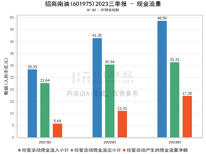 在现金流量方面,招商南油2023年三季度的经营活动产生的现金流量净额为17.28亿元,较上年同期的11.01亿元增长了57.01%。经营活动现金流入小计为48.59亿元,较上年同期的41.35亿元有所增长。经营活动现金流出小计为31.31亿元,较上年同期的30.34亿元有所增长。