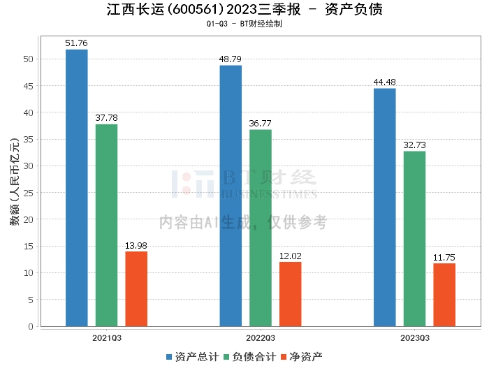 从资产负债方面来看,2023年三季度末,江西长运的总资产为44.48亿元,相比上年度末的47.85亿元有所减少。负债合计为32.73亿元,较上年度末的35.66亿元也有所下降。公司的净资产为11.75亿元,略低于上年度末的12.2亿元。资产负债率为73.59%,相比上年度末的74.52%有所降低。这表明公司的负债负担有所减轻,但总体负债水平仍较高。