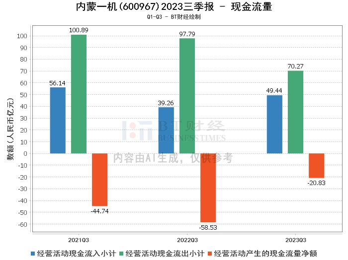 再次,从现金流量方面来看,内蒙一机的经营活动产生的现金流量净额为-20.83亿元。经营活动现金流入小计为49.44亿元,经营活动现金流出小计为70.27亿元。这表明公司的现金流量状况较为紧张。