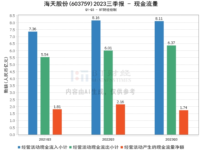 综上所述,海天股份2023年三季度的总体经营状况良好。公司的资产规模在扩大,负债规模在缩小,盈利能力在提升,现金流量状况整体稳定。这表明公司的经营管理水平较高,具有较强的盈利能力和偿债能力。