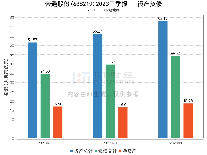 在资产负债方面,会通股份2023年三季度末的总资产为63.15亿元,相比上年度末的64.43亿元有所下降。负债合计为44.37亿元,较上年度末的46.59亿元有所减少。公司的净资产为18.78亿元,较上年度末的17.84亿元有所增长。资产负债率为70.26%,较上年度末的72.31%有所下降。
