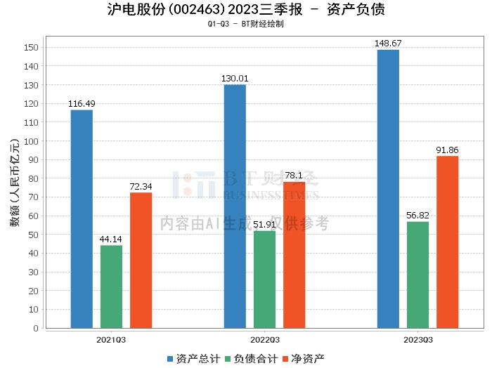 从资产负债方面看,沪电股份2023年三季度末的总资产为148.67亿元,相比上年度末的125.01亿元增长了18.93%。负债合计为56.82亿元,相比上年度末的42.34亿元增长了34.24%。净资产为91.86亿元,相比上年度末的82.67亿元增长了11.11%。资产负债率为38.21%,相比上年度末的33.87%有所上升。这些变化主要源于公司持续盈利,经营活动产生的现金流量净额同比增加,以及一年内到期的长期大额银行定期存款减少。