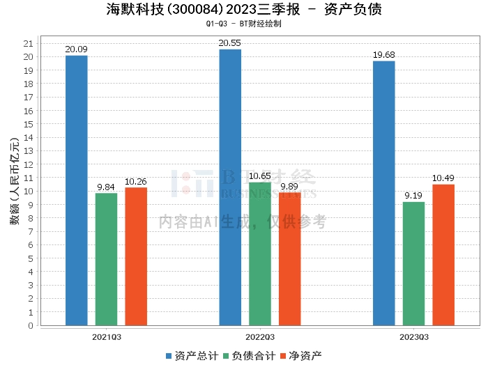 从资产负债方面来看,海默科技2023年三季度的总资产为19.68亿元,相比上年度末的20.67亿元有所下降。负债合计为9.19亿元,较上年度末的10.27亿元减少。净资产为10.49亿元,略高于上年度末的10.4亿元。资产负债率为46.72%,较上年度末的49.69%有所下降。这表明公司的负债结构有所改善,偿债能力有所提高。