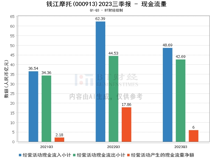 综上,钱江摩托在2023年三季度的经营状况总体稳定,资产总计和净利润均有所增长,但营业收入和现金流量净额有所下滑。这可能是由于市场环境的变化,以及公司在产品研发和市场推广方面的投入增加所导致的。