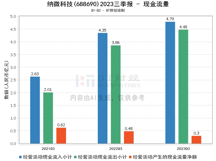 在现金流量方面,纳微科技2023年三季度经营活动产生的现金流量净额为3048.7万元,较上年同期的4815.58万元有所下降。经营活动现金流入小计为4.79亿元,较上年同期的4.35亿元有所增加。经营活动现金流出小计为4.48亿元,较上年同期的3.86亿元有所增加。这主要是由于存货占用资金额增加及前期延缓缴纳的税金在本期解缴所致。